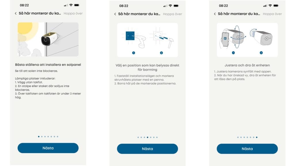 Montera kameran så att den inbyggda solpanelen får direkt solljus. Undvik takutsprång eller andra ytor som skuggar panelen – sitter den alltför skymd behöver du i regel ladda batteriet var tredje månad, medan en öppen placering oftast gör laddning överflödig.