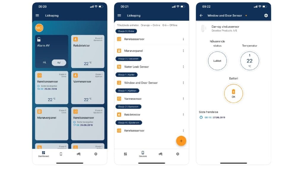 Alla enheter är batteridrivna med flera års beräknad livslängd. Appen visar batteristatus och skickar notiser vid låg nivå. Enheterna kan enkelt flyttas eller parkopplas om, vilket gör systemet flexibelt när hemmet förändras.